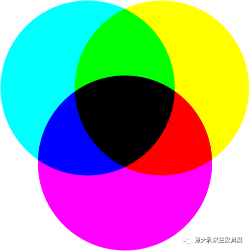 颜料色不是纯色,也与环境色有关系,它们叠加起来会越加越暗,理论上当三者混加后会变成黑色,故称之为减法混色(见上图)。