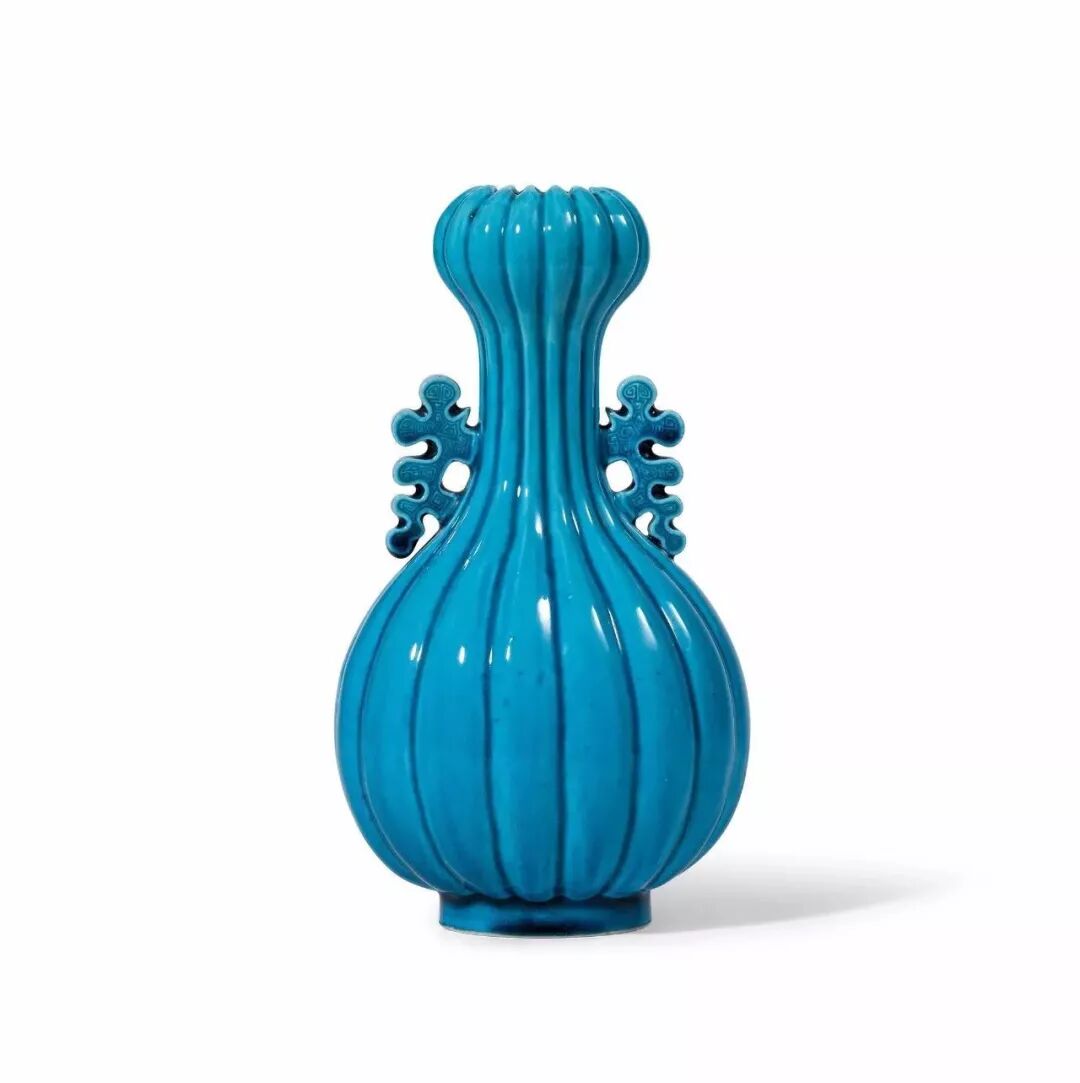 图:清康熙孔雀蓝釉菊瓣蒜头瓶