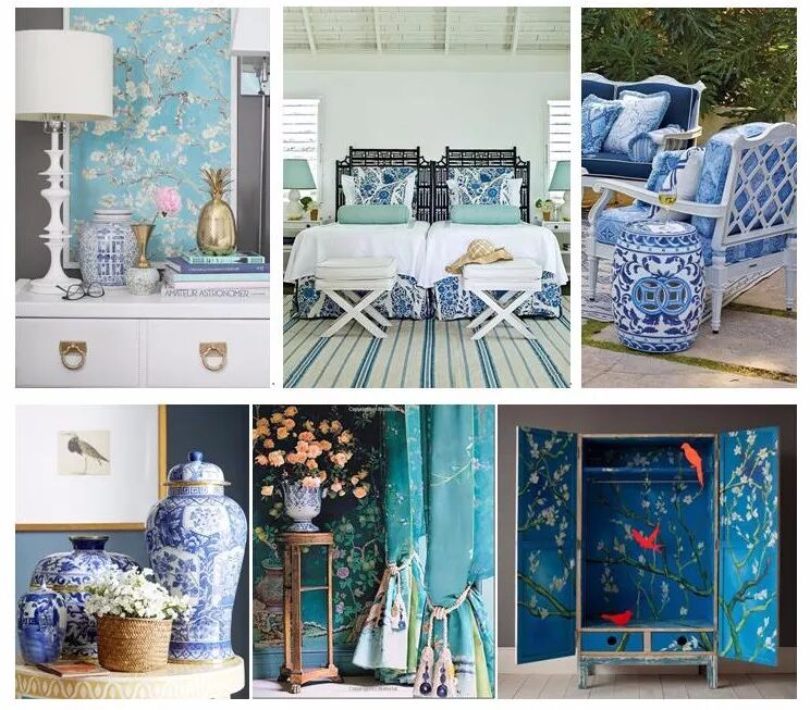 无论China Blue还是Chinese Blue,也许跟法文Chinoiserie的意译有点相近,Chinoiserie指“具中国艺术风格的物品(尤指欧洲18世纪所摹仿的家具,纺织品,陶瓷等的花样设计或装饰); 具中国风味复杂华丽图案的艺术风格”。从上图系列Chinoiserie装饰风格的色彩特点来看,也许更容易理解China Blue的指向,更多时候它指的是从中国瓷器中汲取灵感的各种设计色彩。