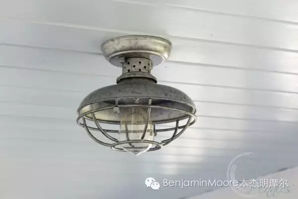 如海面波光一般的淡蓝色天花板,悬挂着乡村风格的镀锌吊灯,当太阳下山的夜晚,灯泡的光效暖洋洋。