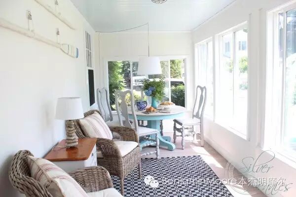 整个日光室选用的颜色是柔白、蓝、灰。