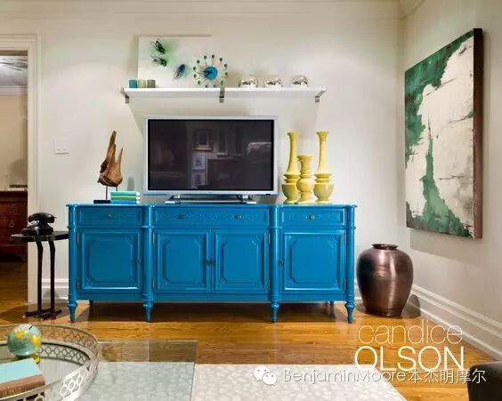 C.O.-一看图片你是否马上就能感受到了色彩的威力?你能想象图片上色彩亮丽造型优美的柜子原是准备弃置不用的物件吗?这就是涂料的威力!用本杰明摩尔的木器漆将原要弃置的原木餐具橱改装成抢夺眼球的装饰柜,既环保又美丽,有谁会不喜欢这样的转变呢!