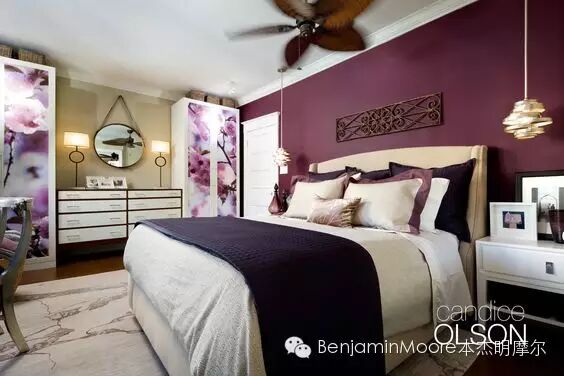 C.O.-这间房的设计焦点是充满戏剧色彩的床头板,带点作旧色彩的紫色是该客户的至爱。