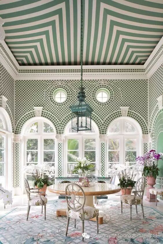 一般人们都习惯重点关注墙的涂刷效果,但一个房间真正最大的那面墙其实是天花,这面墙往往被大多数人忽略。专业设计师的观点是:“不要将天花涂刷成干巴巴的那种白色,因为所有白色涂料都含有一点灰色,它会让房间有往下拉的效果。”