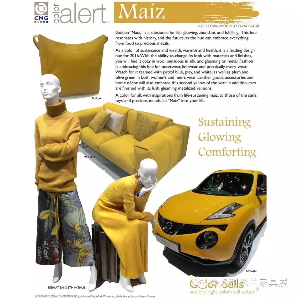 象征营养、富足、温暖与健康,金黄玉米色是2016年度的设计主导色,人们将它运用于不同的材料,通过先进的加工技术获得人想要的效果:金黄色的羊毛制品惬意舒适,金黄色的丝绸布料华丽性感,金黄色的金属制品闪闪发光,各具特色。在服装方面这个颜色多见于外套、针织品、实用日常着装,可以跟深蓝、灰、白相组合,也可以和紫红、橄榄绿相搭。皮料制品、饰物和家居装饰件可大胆运用这一玉米黄色,而玉米黄的汽车金属车身更是光芒四射,华丽耀眼。