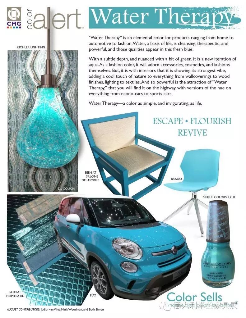 时尚演绎:“水是生命之源,意指清洁、舒缓身心及无边无际的能量。水的这些品质可见于湖蓝色。而新生概念的“水疗系列”指的是由这个自然元素色组建而成的产品系列,从家居产品到汽车行业到时装行业。