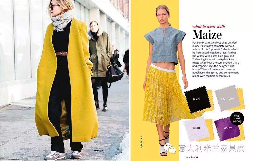 时尚演绎:金黄的玉米为人类提供生命食粮,它饱满鲜亮、富饶丰盛、使人心满意足。这个颜色能呼召起人类对历史与未来的共鸣情感,从食物到珍贵的金属,它是物质世界的主要色彩之一。