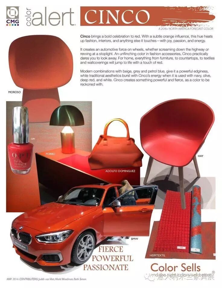 它为汽车的轮子增添动力,无论是高速公路上的狂飙,还是红灯前的停驻大晒颜值,它的强劲能量都不容忽视。这个色彩的时尚配饰显得气场张扬,咄咄逼人,而将这个色彩引进家中,无论从家具到台面板、织物、墙面涂层、或墙纸,只要用上一点点,生活立马呈现火红火红的兴旺场面。