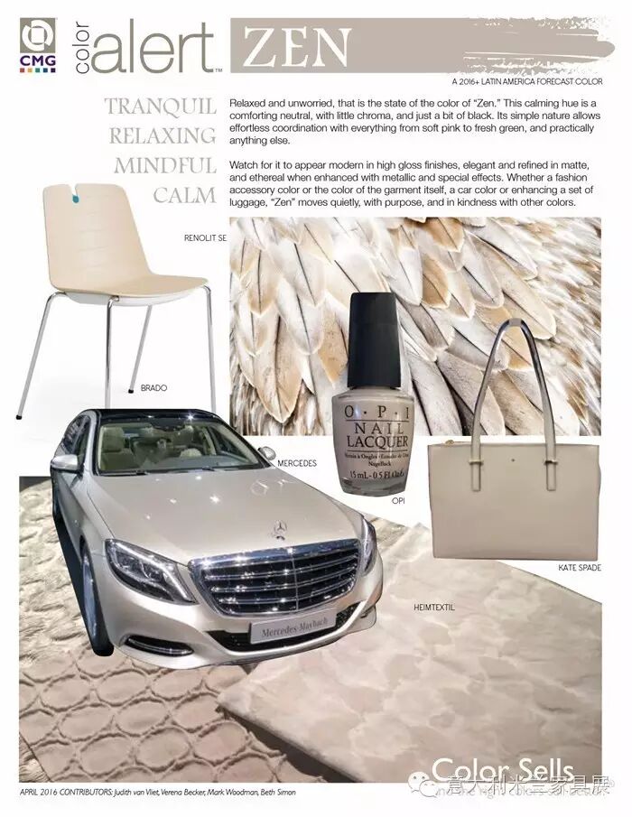 时尚演绎:从容不迫,无忧无虑,它带出的色彩意境:禅。这个颜色属舒适的中性色,保留一点点色彩纯度,加入一点点黑色,它纯朴简单的属性允许它能轻松无阻地与柔和的粉色及清新的绿色相协调,也适用于其它色彩。