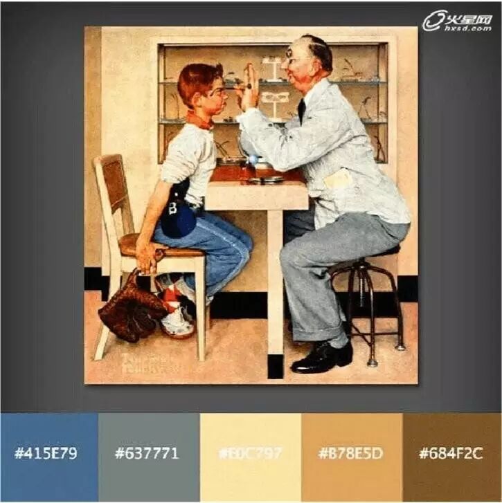 诺曼·洛克威尔也许是有史以来美国最具代表性的画家。从20世纪初期到中期,他所描绘的美国人日常生活的作品一直俘获千百万人的心(他制作了4000 幅作品!)。洛克威尔的色板让人着迷,之所以选择了《验光师》,是因为这幅作品完美体现了他使用色彩讲故事的能力,他能准确描绘细节的色彩。