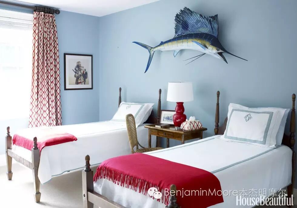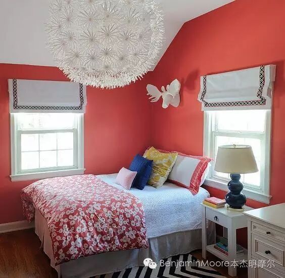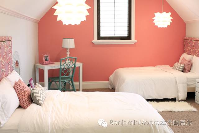 图注:任何时候珊瑚红都是海滨风情的加速器,它与松石绿的搭配是经久不衰的海滨时尚风,用于男/女孩房都是好的。