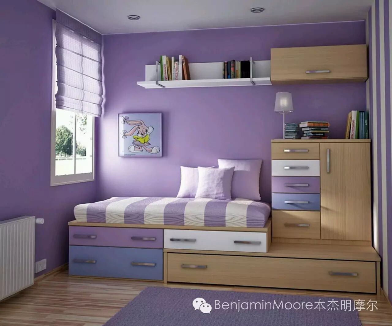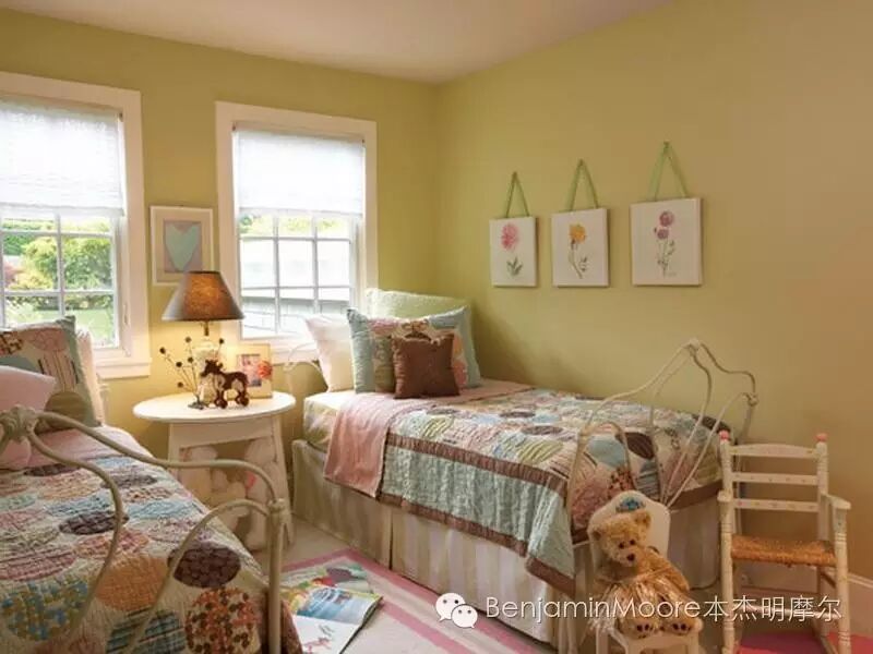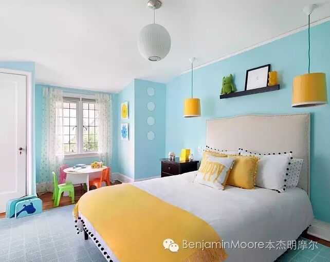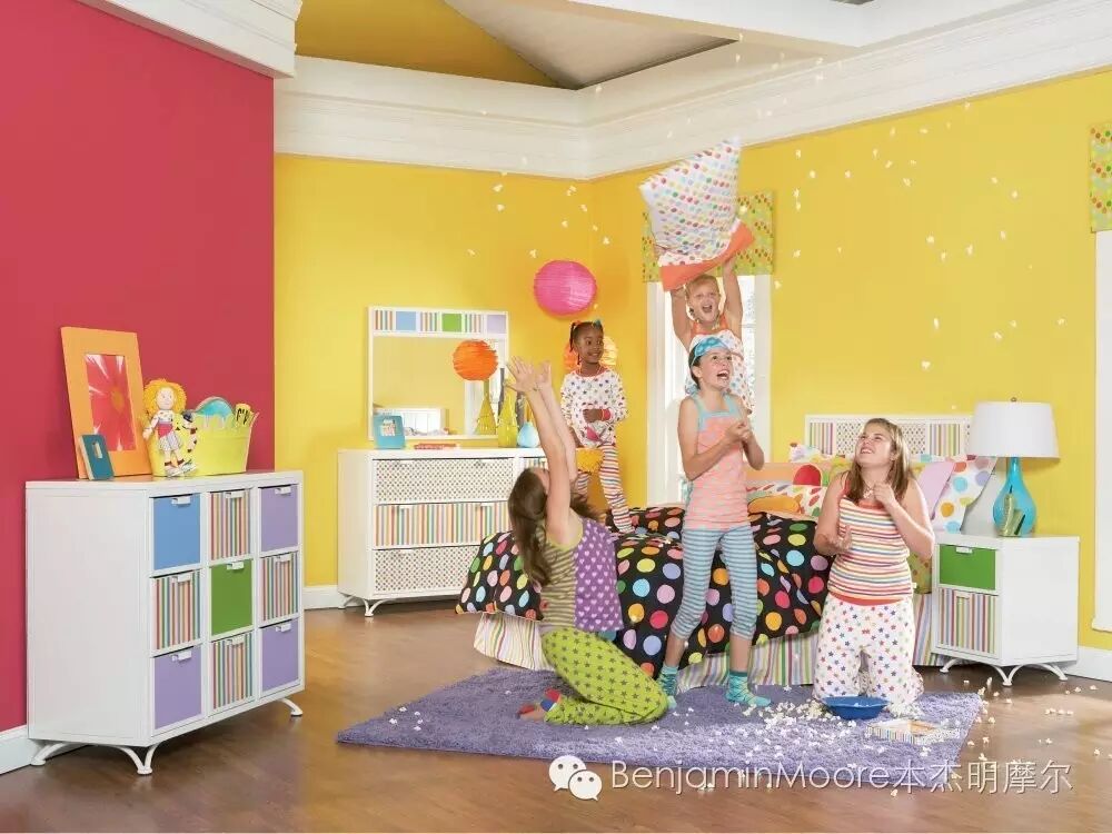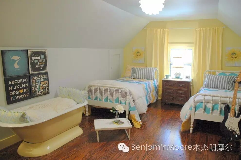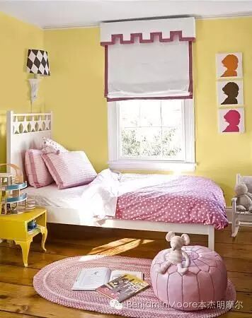 图注:这个名为“日出晨安”的黄色,用于儿童房仿佛有一种“唤醒”功能,你能想象孩子们早上赖床那股让人头疼的劲,然而有了这道日出的亮光,如果房间的窗户光线充足的话,只要拉开窗帘,让孩子们看见墙上的光,第一反映就是迫不及待,起床迎接美好早晨。与粉色系的紫红床上用品相搭配,间接互补色彩方案既充满阳光同时不放弃女孩儿的浪漫心思。