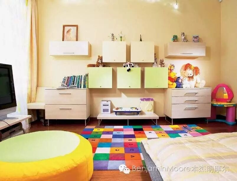 图注:现代简约风儿童房,小巧而密集的立方柜体错落排列于米黄色墙体上,下是七彩棋盘地毯,加上明黄色的圆布墩,形成明亮、乐观、有趣又有序的男孩房。