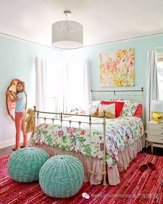 图注:这间女儿房墙面运用的浅绿色原是低调的梦幻感,即便同时运用了深一度的瀑布绿南瓜造型坐墩,但设计师将鲜红的地毯及抱枕揽进了空间,结果产生一种出人意料的心跳,眼前一亮的彩色清新。这是红绿撞配色方案的一种,带蓝色底的浅绿与深红营造出别具一格的都市田园梦。