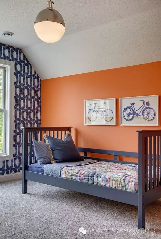 图注:海军蓝是经典的男孩房用色,蓝与橙则为经典的对立色配色组合,因此将这两种颜色(图为深蓝与活力橙)邀请进男孩房能经得起成长时间的考验。