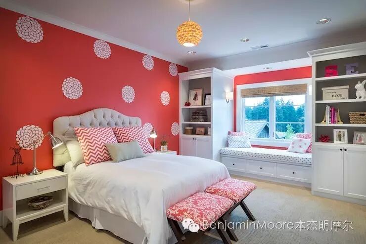 图注:将红色涂刷床头背景墙及窗户边框-孩子的休闲阅读处,因为用了大量的白色作为过渡色,因此这里的红色不会有压抑的效果,房间充满活力。