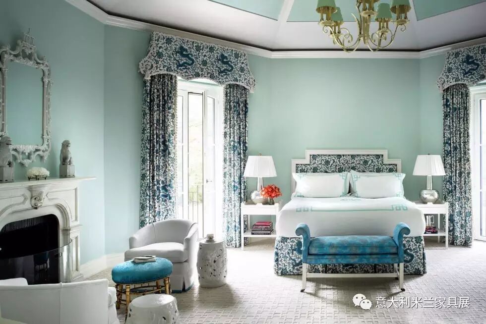 蒂芙妮蓝:有些色彩天生讨人喜悦而且永不过时,其秘诀在于它总是能把别人衬托的更美丽。这个卧室是典型的单色配色方案:柔和的浅蓝绿色墙面(Benjamin Moore 2050-70 Blue Bonnet),宁静的深蓝绿色窗帘,同一色彩家族但明度更高的蓝绿色家具配件,高技巧地实现了宁静氛围的色彩层次。