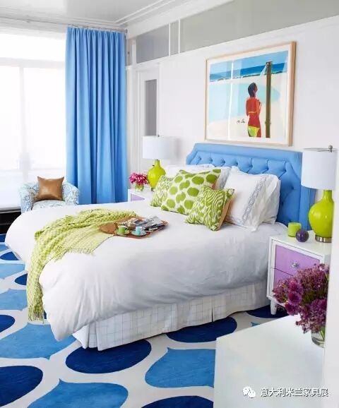 石灰绿:适量的高明度纯色能让空间体现个性却不空流表现,就如这个蓝白空间里的高明度点缀色-石灰绿,激发春天的生机。空间的画中画是床头板上方的艺术品,其构图与用色比例都与卧室的如出一辙;地毯的构图与双色拼图也为空间带来一点小兴奋。