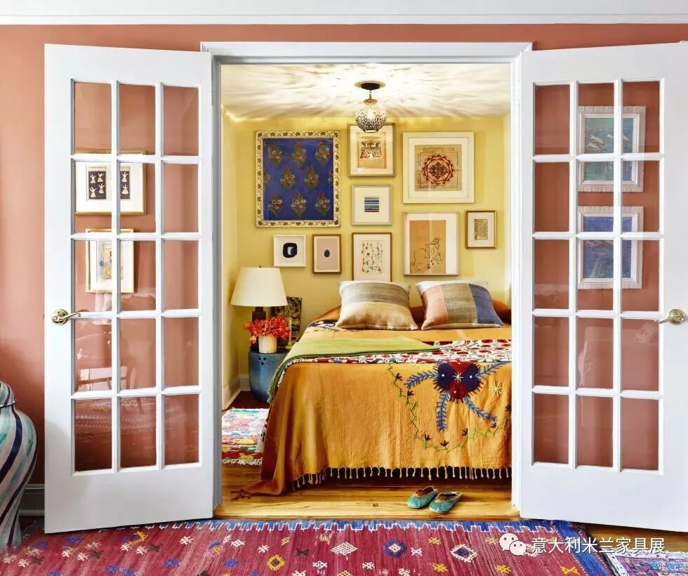 阳光黄:由于房间本身缺少自然光,设计师将充满阳光气息的黄色用做墙面,营造出沐浴于碧海阳光下的空间视觉。手工绣花床单、色彩鲜艳的土耳其基里姆地毯及羊绒毯,更为小窝居增添温暖。