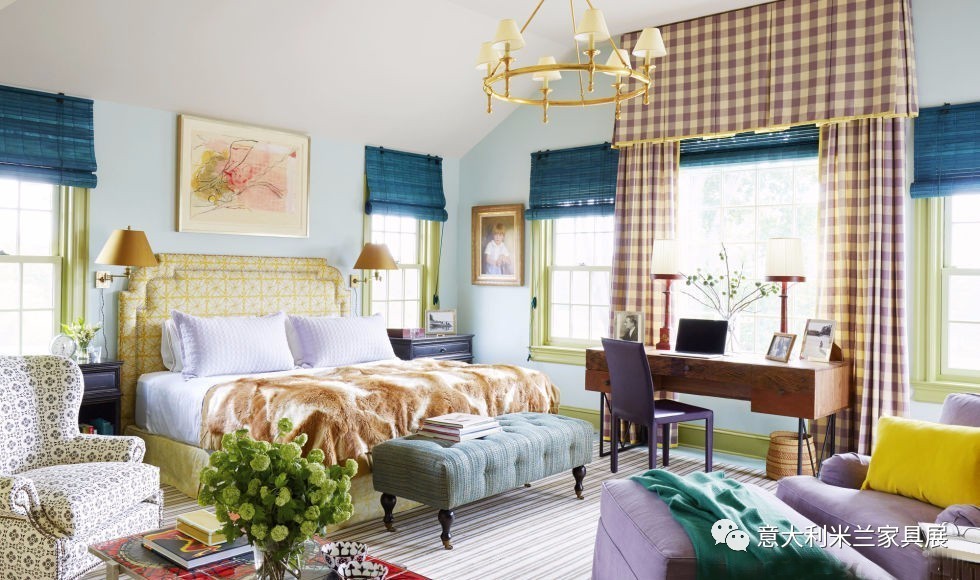 蓝橙黄紫:将蓝橙黄紫双重互补配色方案用于卧室已是一个大胆的冒险,再用方格纹棉布窗帘作为空间的焦点-更让一般人觉得匪夷所思。但这个自定义为田园风格的卧室,它可以有些任意,如果居住者愿意。