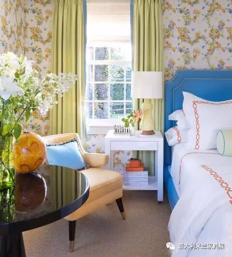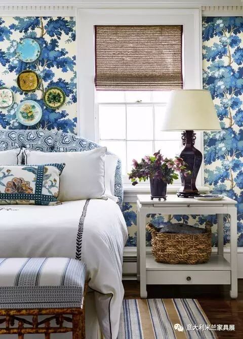 蓝:光线充沛,蓝海慷慨。青花瓷蓝花卉墙纸,水彩蓝定制床头布包与床尾凳,让沐浴晨光醒来的人仿若置身一座风信子与鸢尾花遍地盛开的花园。