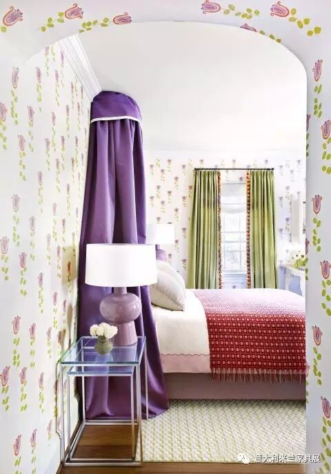 紫和绿:尽管这间女儿房用的色彩几乎都是灰调,但皇家紫的帷帐却为它增添贵族气息。郁金香花卉墙纸及经典的小球球条纹装饰落地窗帘,同样传达优雅小淑女气质。