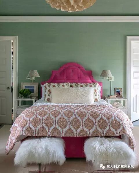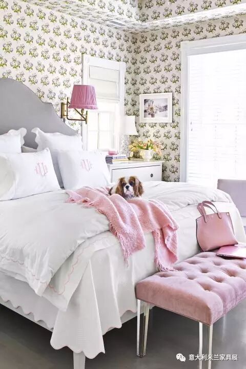 粉红玫瑰:主卧委实不必羞怯于粉红,这间墙顶花卉壁纸相连的主卧,选用了深灰度的粉红色壁灯、手工绣花的粉红色花边床单及深扪扣的床尾凳,倍显温柔雅致。