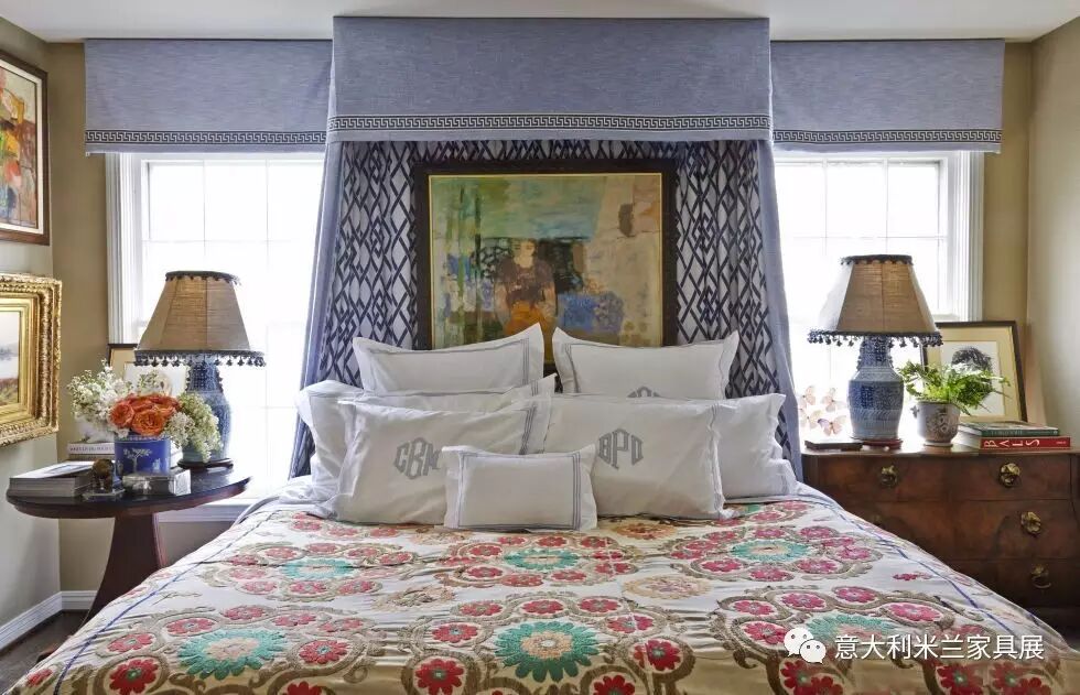 郁金香红:精彩图案是这间卧室的焦点:感性怒放的郁金香罗马风格窗罩与床头板布包,床上用品与床尾凳布包花纹却为清一色几何构图,感性与理性的平衡呼应。