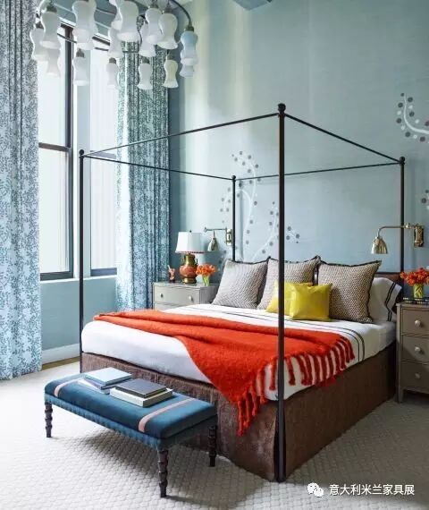 水蓝:墙上精致的印花图案抽象树与棕色的床裙,柔和了四柱钢床的硬冷感;橙红色的羊毛毯及其它装饰品也为水蓝色空间注入生机与温暖。平衡-始终是空间氛围营造的关键。