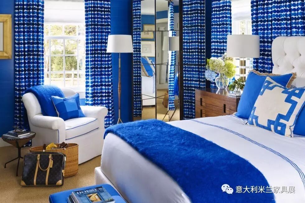 铬蓝:没有骄阳与海风会不堪设想这一铬蓝的深冷,大量白色的运用也适宜地稀释铬蓝的冷傲逼人。这是一间海滨卧室,墙上安装有四面交叉反射的玻璃艺术镜,坐在窗户边上扶手椅的位置,能看到镜子对整个空间的反射画面。