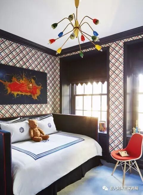 三原色:鲜艳的红黄蓝人造卫星吊灯与蓝红色的网格图案墙纸,让深色背景的男孩房充满神秘的创造力。