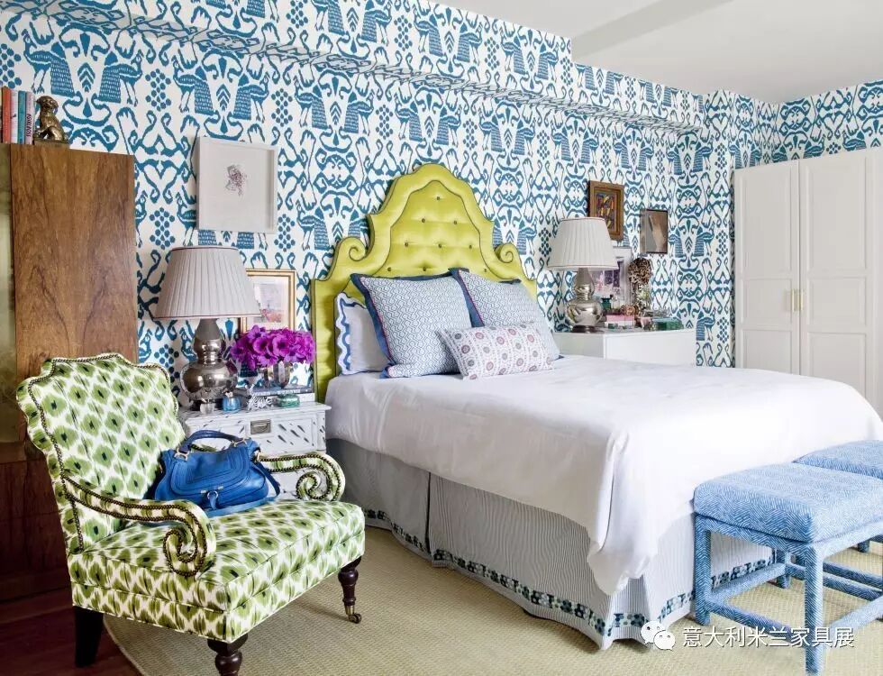 蓝和红:这是2017年纽约AD“色彩天才奖”得主尔斯·里德(Miles Redd)的作品,一间小男孩房的改造。红色地毯是原有物件,尔斯·里德配合它而将墙面涂刷成人造木纹的花式,再用与地毯同样鲜红线条勾勒出轮廓,与窗帘的红色形成层次。