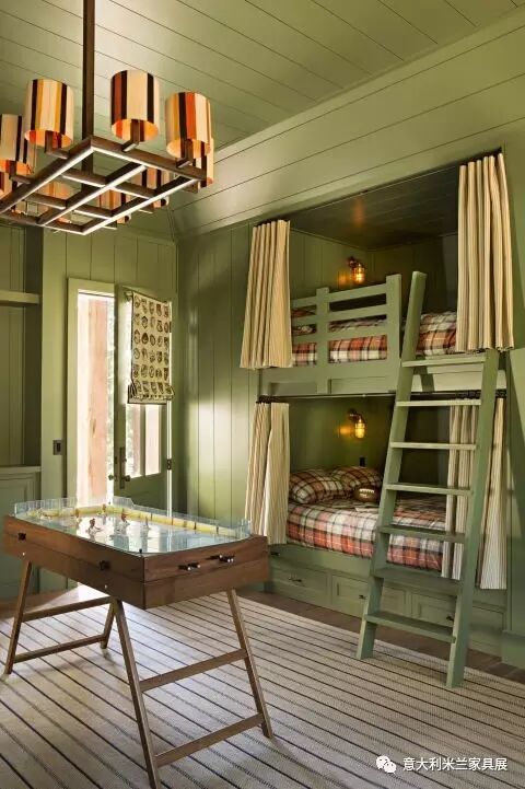 绿:将男孩子设计成一辆火车的卧铺车厢,满足他们的旅行梦想。(色彩编号:Benjamin Moore 2146-20)