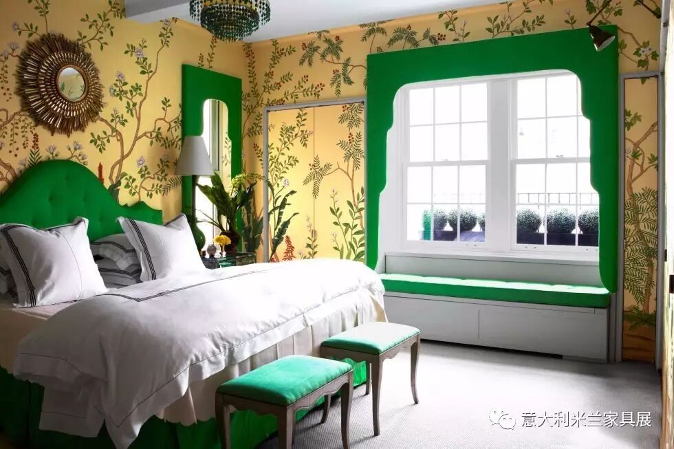 芥末黄与祖母绿:这是本篇里出现的第三个尔斯·里德的作品。手工绘制的芥末黄丝绢墙布,窗户与镜子的祖母绿帷幔造型颇具异国风情,它们跟床头布板及窗边座垫一样都是用优质丝绢完成。