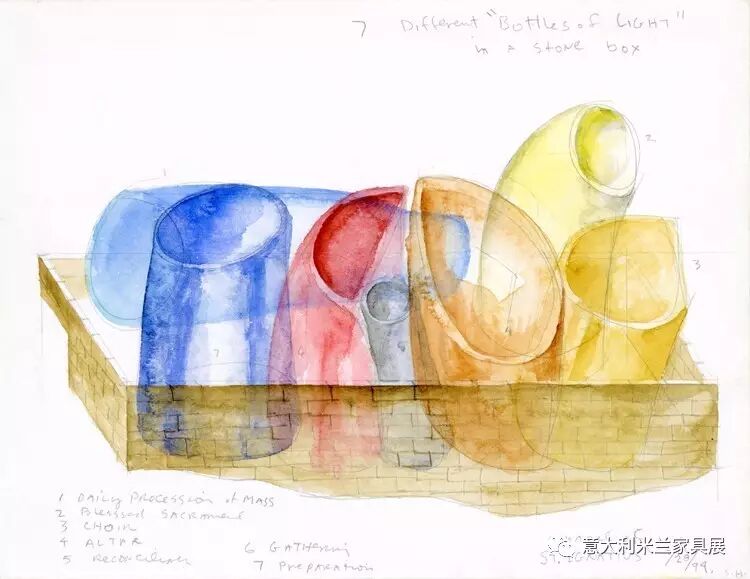 建筑孕育的理念是将教堂想象成一个石头箱子,内有7个聚光瓶,每个瓶子代表耶稣会天主敬拜中的一个主题。当光线穿过特定区域的瓶子时,光池与色彩对空间的物理属性及精神内涵做出定义。