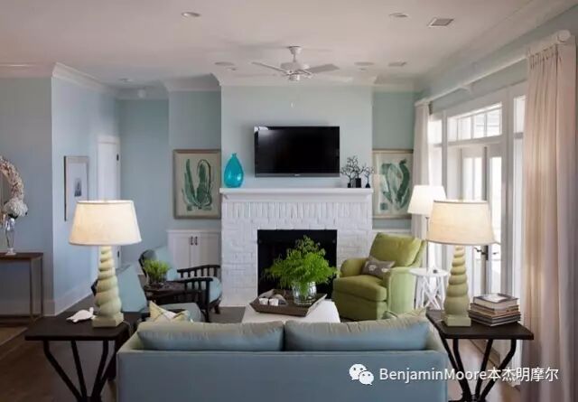 直觉蓝与粉彩绿结合用于客厅,效果很海滨。