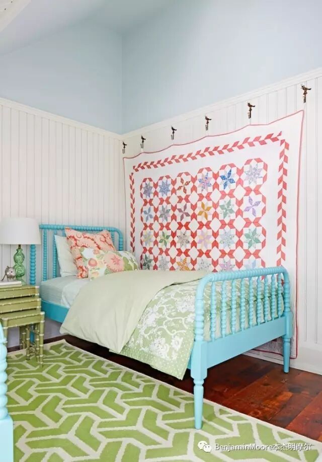 在这个粉彩绿的房间里添加一件鲜红色的家具、块毯或装饰品,会是非常耀眼醒目的选择。