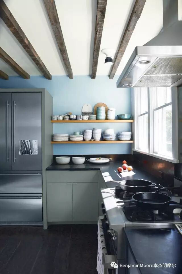 当然,将这个蓝色用于厨房墙面,给人感觉相当洁净环保。