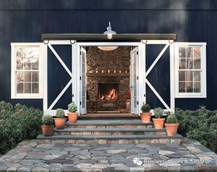 图:深蓝色谷仓风格房屋,伴有大块石道及楼梯