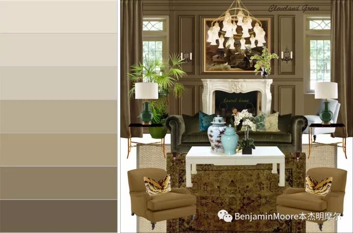 图右为墙面涂刷1525克里夫兰绿的客厅。