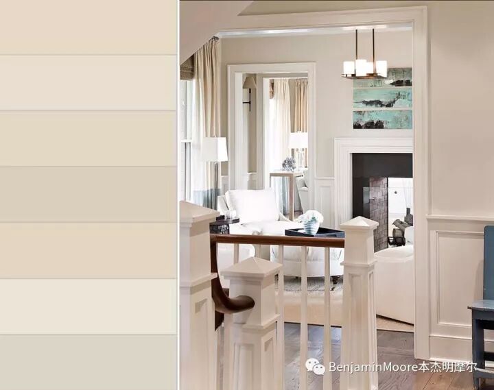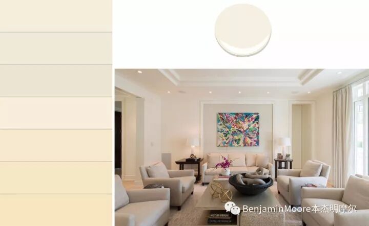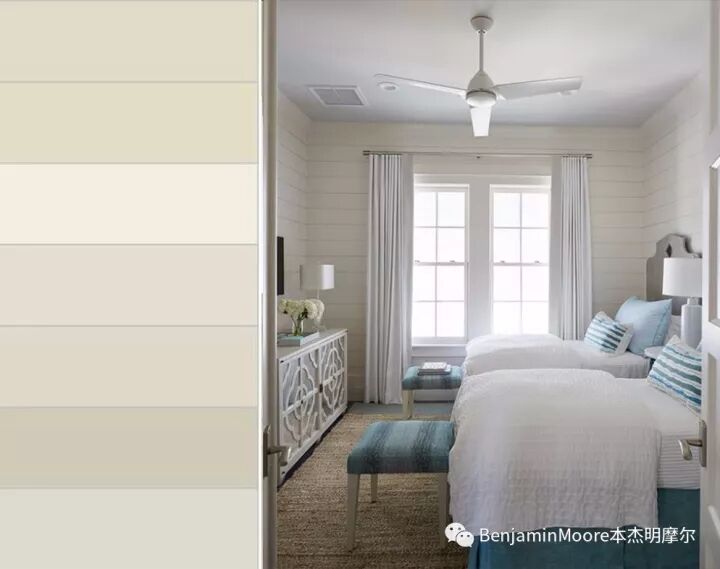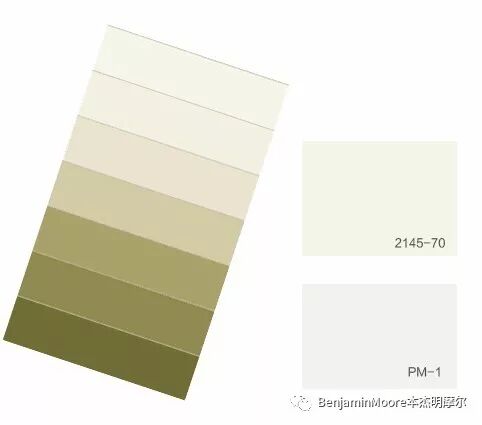 棉花球白[Benjamin Moore 2145-70]是从鳄梨绿[2145-10]加白稀释而来,底色含有黄绿,当大面积涂刷上墙后会跟纯白色[BenjaminMoore PM-1]形成明显的不同(见下图),因为是一个明亮的暖白色,所以它四季皆宜。