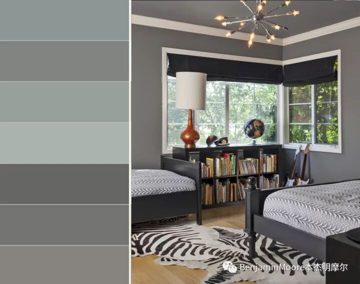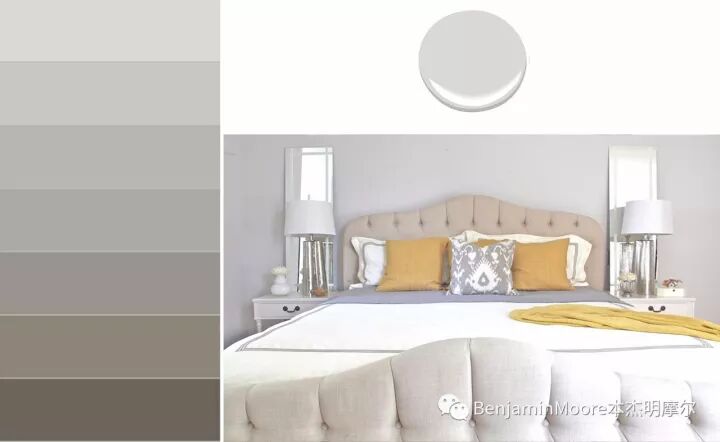 一个相当柔和的灰色,介于冷与暖之间,伴有银光反射的色彩意象。用于卧室是慰籍宁静,用于浴室是清新洁净,用于书房是理性镇静。