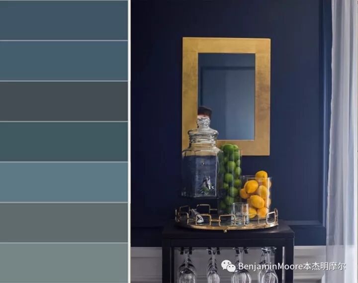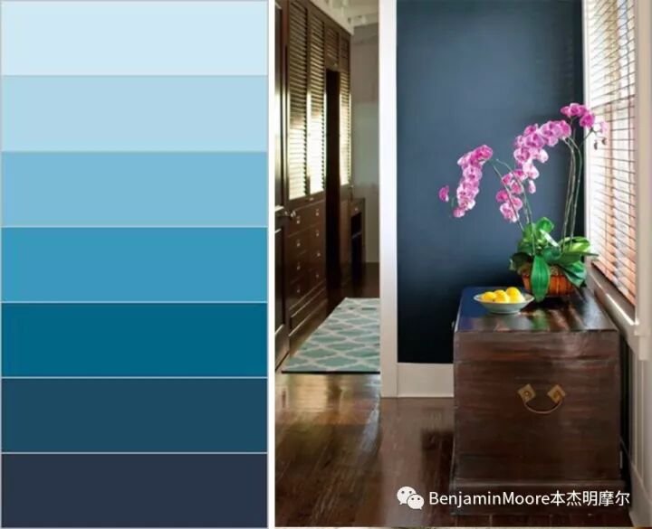 图右为墙面涂刷深皇家蓝的玄关过道。