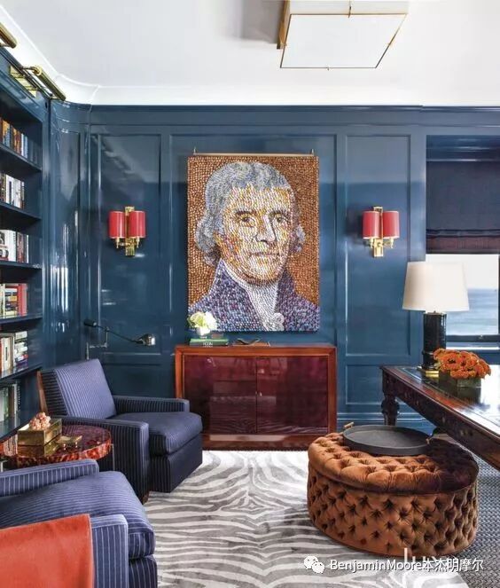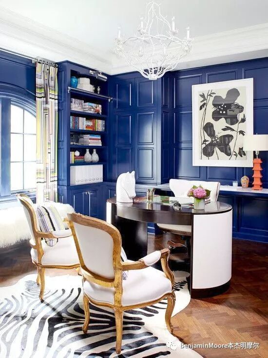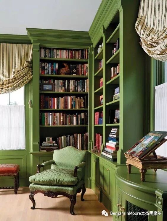 传统格调的家庭书房总是用深棕色、高饱和度的酒红色和深绿色,但如今的人们更偏向于选择轻盈而明亮的色彩或深颜色的传统风格装饰。每个人可以根据自己的喜好来选择代表自己的色彩,目的是能在这个空间中获得足够的放松。