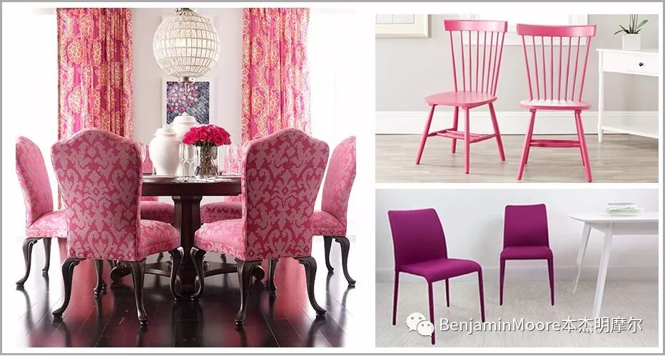 餐桌、桌椅及用餐区范围的地毯是营造餐厅空间的焦点。选择这类物件的时候一定要选择不同色调的粉红,避免看起来和主墙“差不多”一样的粉红。热烈浓郁的粉红色椅子匹配白色桌子,既可形成色彩的对比度又能跟各种地毯地毯和谐搭配。中性色的餐桌也可以为粉红色餐具及相关装饰品提供更大的色彩包容度。