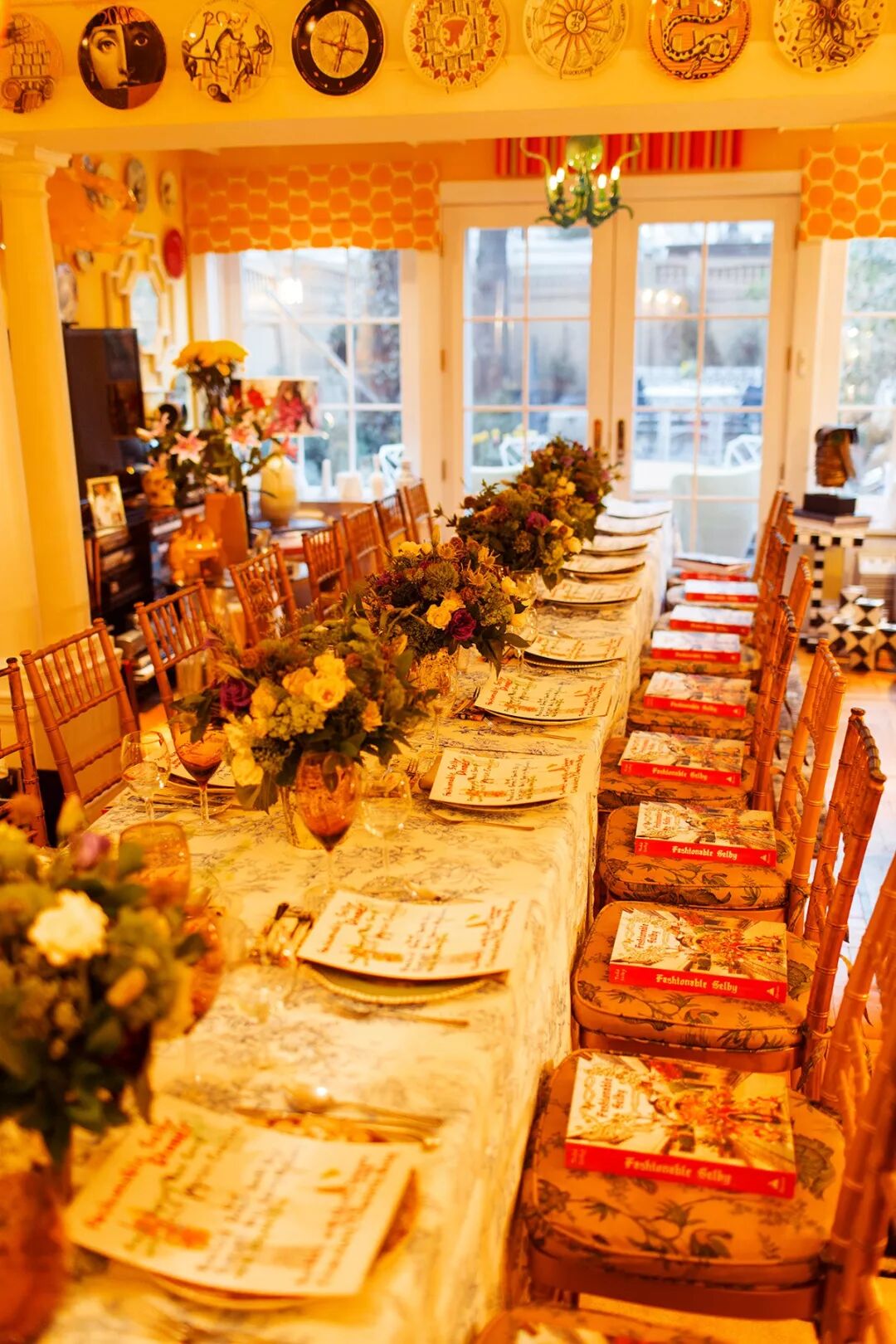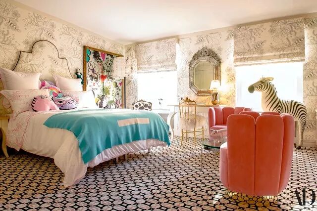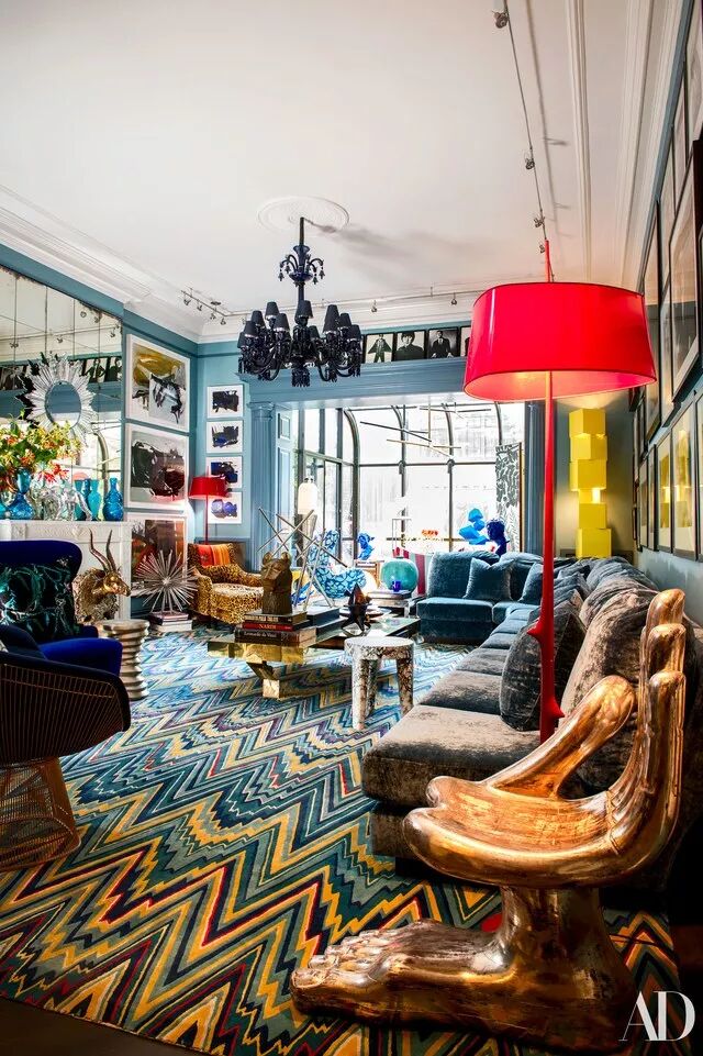 色彩狂野,趣味横生。图左下角是一只美国已故艺术家Tony Duquette设计的幽灵蜗牛灯,它的造型正向日光浴室一组争奇斗艳的沙发椅爬去;落地灯与吊灯皆属Apparatus后现代品牌;屏风出自充满东方风情品牌的de Gournay定制品。
