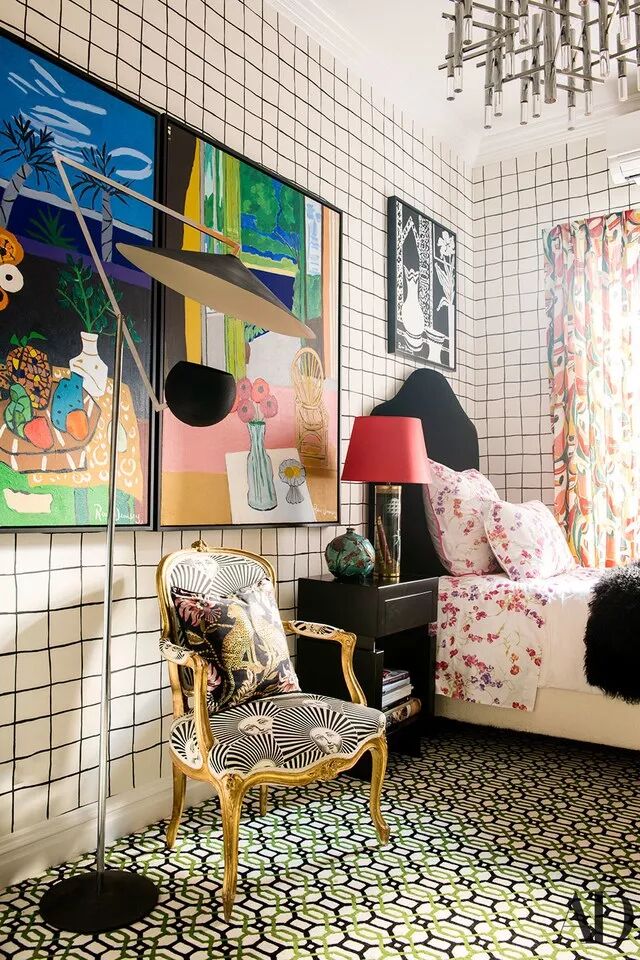 Marie-Hélène Demsey卧室的墙面、窗帘和床头织物出自舒马赫织物品牌,扶手椅出自法国设计师India Mahdavi*的设计,艺术品出自法国品牌朗雯(Lanvin)的设计师Alber Elbaz。