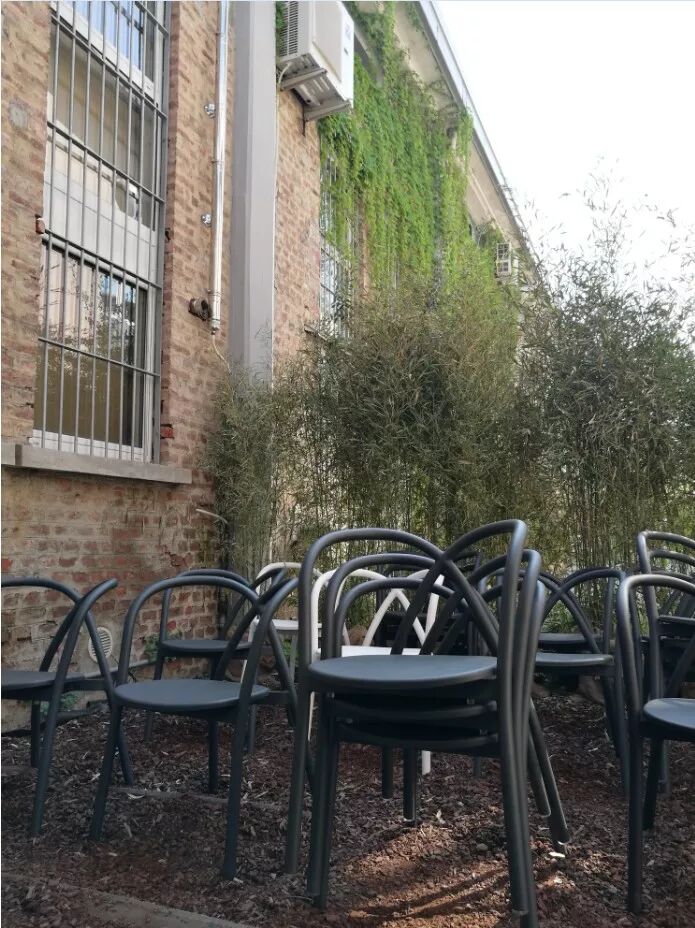 图:展馆的露天后院随意摆放着由如恩设计的Ming系列,也是展馆设计的特点之一:探索家具在住宅与城市环境中的关系。