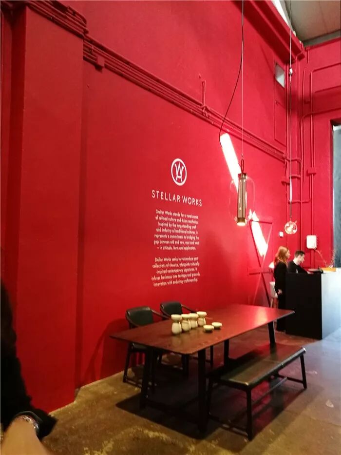 STELLA WORKS将其产品的精神属性定位为“亚洲情怀•永恒工艺”,强调材质与风格的自然、简约、现代。今年的展馆设计跟往年的主用自然色系特点有所不同,改为大胆地将黑、红、黄三色贯穿其中,以古建筑图构造空间背景的手法带领参观者探索家具在不同物理空间及心理空间的体验。工作人员向笔者介绍展馆设计理念时说:如恩设计使用黑色象征去除物件的城市物质化特点,并将其带到一个抽象的层次;而黄色与红色则是今年品牌使用的艺术方向色。