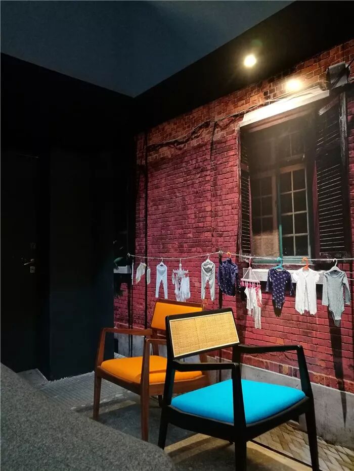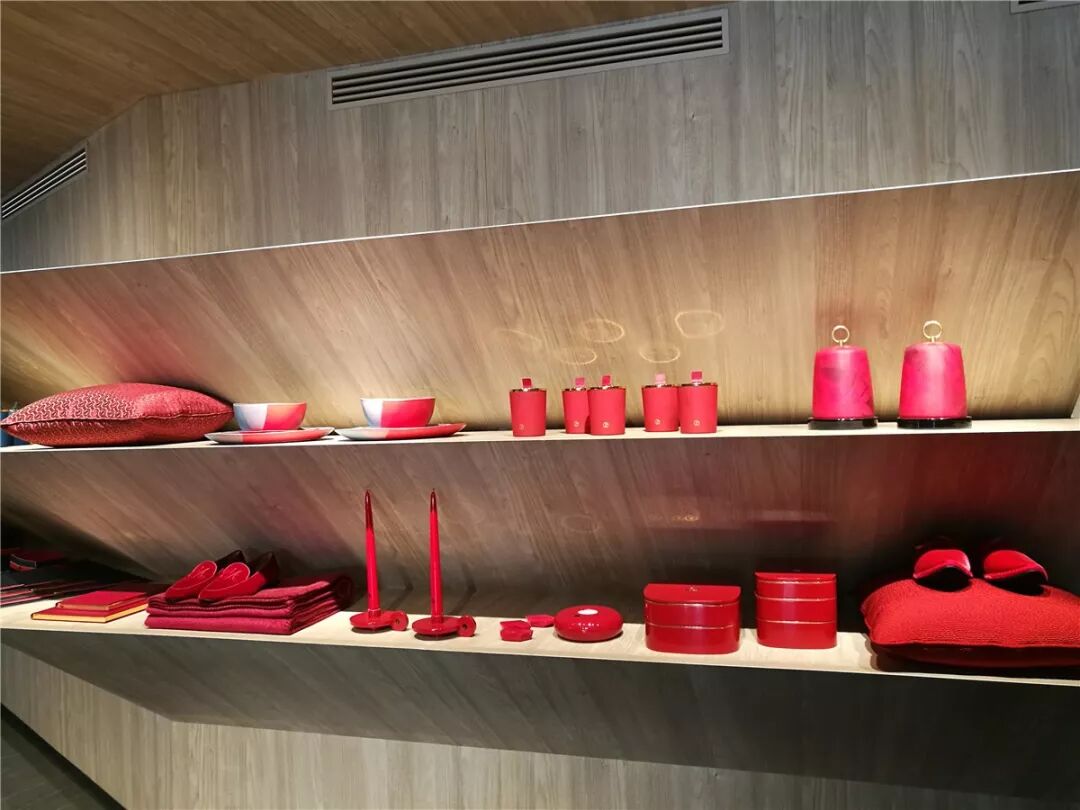 图:二层展厅的墙面背景色是一层的延伸,但将红色从墙面转到各种饰品中。
